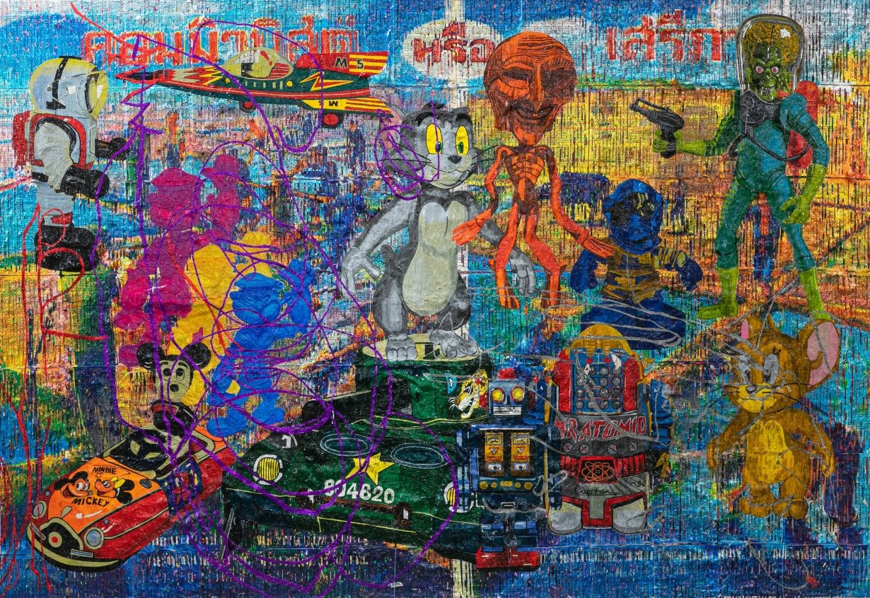 The dazzling giant in this display of over 60 collages by Chiang Mai-based artist and university lecturer Thasnai Sethaseree is not as spontaneous as it first appears. With each step closer, the billboard-size Cold War: the mysterious (2019–22) seems a little less indebted to the wild, improvisational gestures of action painting and a little more grounded in a particular time and place: the Cold War period in dictatorial Thailand. By the time you’ve reached the ‘do not cross’ line, layer upon layer of figurative elements – strips of shredded history books, comic book covers, the faces of political figures – can be seen floating amid a vast technicolour cosmos of blobs, orbs and scribbles.