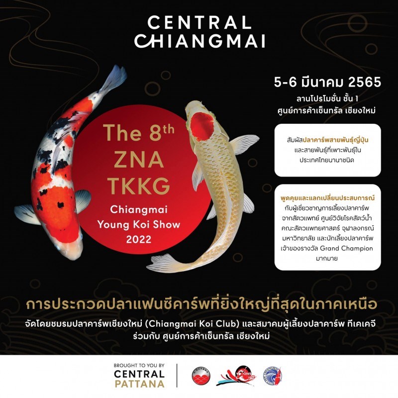 วันที่ 5 - 6 มีนาคม 2565 ณ ศูนย์การค้าเซ็นทรัลเฟสติวัล เชียงใหม่ กลับมาอีกครั้งกับ "การประกวดปลาแฟนซีคาร์พที่ยิ่งใหญ่ที่สุดในภาคเหนือ" The 8th ZNA TKKG Chiangmai Young Koi Show 2022 จัดโดยชมรมปลาคาร์พเชียงใหม่ (Chiangmai Koi Club) และสมาคมผู้เลี้ยงปลาคาร์พ ทีเคเคจี ร่วมกับ ศูนย์การค้าเซ็นทรัล เชียงใหม่ สัมผัสปลาคาร์พสายพันธุ์ญี่ปุ่นและสายพันธุ์ที่เพาะพันธุ์ในประเทศไทยนานาชนิด พูดคุยและแลกเปลี่ยนประสบการณ์กับผู้เขี่ยวชาญการเลี้ยงปลาคาร์พ จากสัตวแพทย์ ศูนย์วิจัยโรคสัตว์น้ำ คณะสัตวแพทยศาสตร์ จุฬาลงกรณ์มหาวิทยาลัย และนักเลี้ยงปลาคาร์พและเจ้าของรางวัล Grand Champion มากมาย พบกัน 5 - 6 มีนาคม 2565 ณ ลานกิจกรรมชั้น 1 ศูนย์การค้าเซ็นทรัลเฟสติวัล เชียงใหม่
