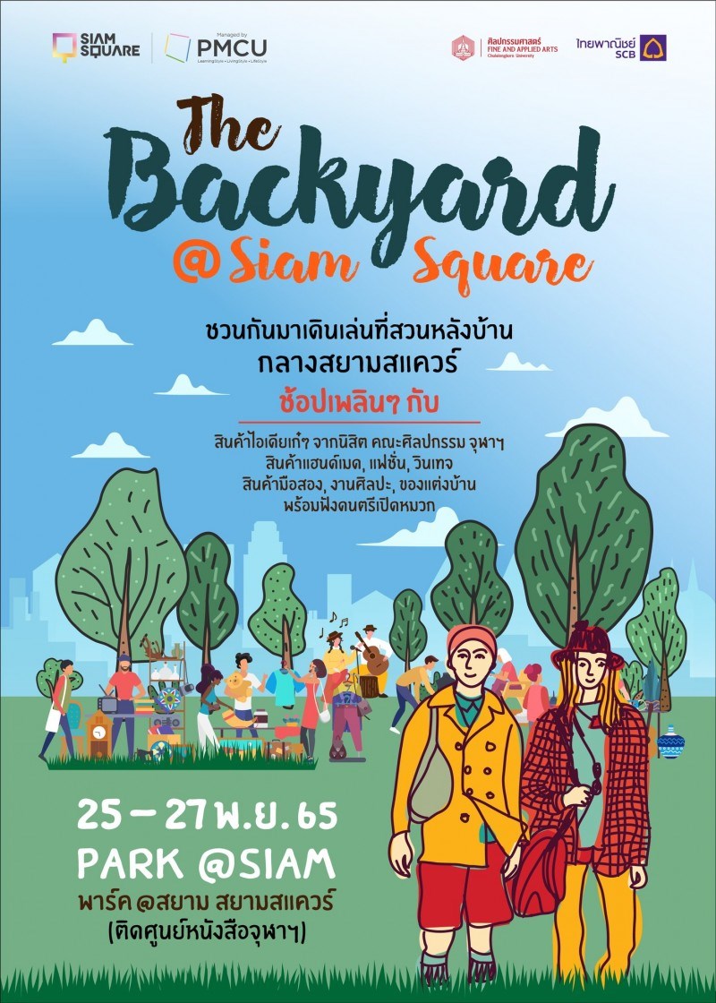 งานนี้ชวนทุกคนมาพักผ่อนหย่อนกาย สัมผัสความร่มรื่นกับมาร์เก็ตในสวน "The Backyard @Siam square" ช้อปชิลๆกับผลงานสินค้าไอเดียเก๋ๆ นำทีมโดย คณะศิลปกรรมศาสตร์ จุฬาฯ ทั้งสินค้าคราฟท์ๆ สินค้าแฮนด์เมด เสื้อผ้ามือสอง ของแต่งบ้าน สินค้าวินเทจ จากน้องๆนิสิต นักศึกษา ร่วมด้วยผลงานศิลปะจากศิลปินดัง พร้อมโยกตัวตามสนุกสนานไปกับเสียงเพลง ปล่อยใจสบาย ๆ เหมือนพักผ่อนที่สวนหลังบ้าน หนาวนี้อย่าได้พลาด! วันที่ 25 - 27 พฤศจิกายน 2565 เวลา 16.00 - 21.00 น. Park @ Siam square (ข้างอาคารวิทยกิตติ์ ศูนย์หนังสือจุฬาฯ)