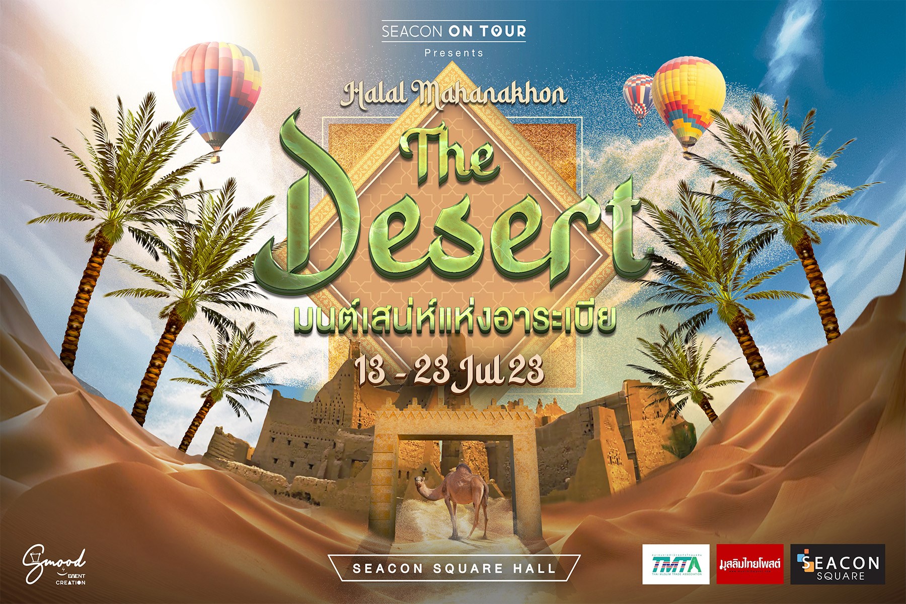 ซีคอนสแควร์ ร่วมกับ สมาคมการค้านักธุรกิจไทยมุสลิม(TMTA) และมุสลิมไทยโพสต์ จัดงาน “The Desert มนต์เสน่ห์แห่งอาระเบีย” ยกทะเลทราย “ดิรอียะฮ์”(Diriyah) เมืองหลวงเก่า อัญมณีแห่งราชอาณาจักร ซาอุดีอาระเบีย ขึ้นกลางซีคอนสแควร์ พร้อมพาคุณอิ่มอร่อยกับอาหารฮาลาล         พรีเมียมสุดยิ่งใหญ่เเห่งปี แบบจัดเต็ม กว่า 60 ร้านค้า จัดขึ้นในวันที่ 13 - 23 กรกฎาคม 2566 บริเวณ ซีคอนสแควร์ ฮอลล์ ชั้น1 ศูนย์สรรพสินค้าซีคอนสแควร์ ถนนศรีนครินทร์