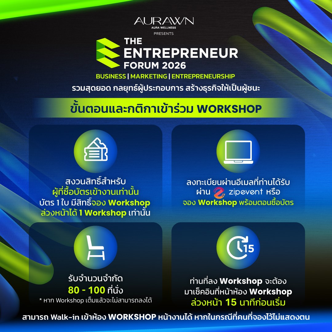 พบกับ Sessions เจาะลึกและ Workshop ใกล้ชิดที่จะเปลี่ยนไอเดียของคุณให้เป็นแผนธุรกิจที่ทำได้จริง เรียนรู้จากประสบการณ์ตรง มุมมอง และบทเรียนของผู้ประกอบการที่สำเร็จระดับประเทศ