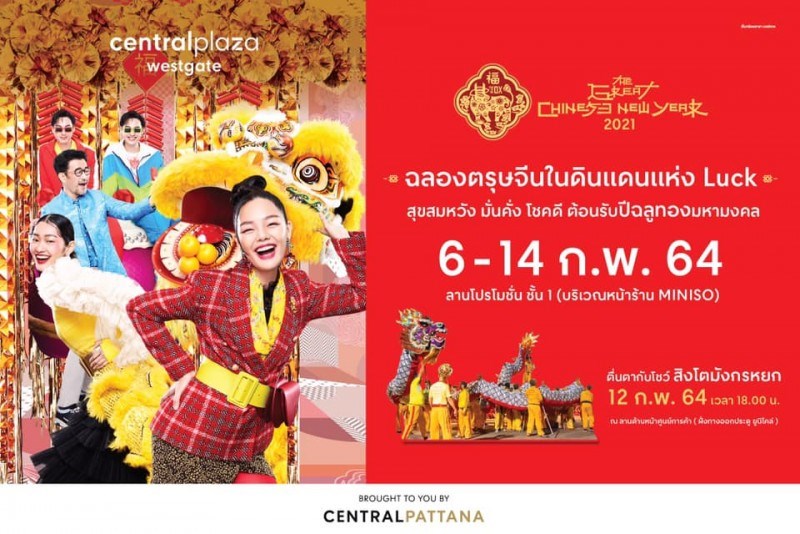 The Great Chinese New Year 2021 : The Land of Luck วันที่ 6 - 14 กุมภาพันธ์ 2564 ณ ชั้น 1 ลานโปรโมชั่น (หน้าร้าน MINISO) เซ็นทรัลพลาซา เวสต์เกต สุขสมหวัง มั่นคั่ง โชคดี ต้อนรับปีฉลูทองมหามงคล เอร็ดอร่อยอาหารจีนเลิศรส พร้อมจับจ่ายสินค้ามงคล ที่ตลาดมังกรจีน ทำนายดวงชะตาช่วงตรุษจีน กับ เซียมซียักษ์ รับโชคใหญ่ เสริมมงคล ด้วย กังหันแชกงหมิว นำโชค ดึงดูดสิ่งดีๆ ความเป็นมงคลให้ชีวิต ตื่นตากับโชว์สุดอลังการ ชมการแสดงโชว์จากคณะสิงโตมังกรหยก ดีกรีแชมป์ระดับโลก (12ก.พ.นี้เวลา 18.00 น. เป็นต้นไป ที่ลานหน้าศูนย์การค้าฯ) เพลิดเพลินดนตรีจีน กับการแสดงพิณกู่เจิ้ง ทุกวันหยุดสุดสัปดาห์