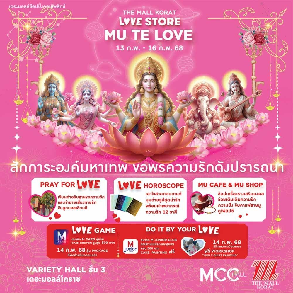 พบความสุขและกิจกรรมในเดือนแห่งความรัก The Mall Korat Love Store MU TE LOVE มูทุกความปัง ส่งเสริมทุกความรักสมดังปรารถนา 13-16 ก.พ. 68 นี้ ที่วาไรตี้ฮอลล์ ชั้น 3 เดอะมอลล์โคราช กิจกรรมสายมู ที่หลายคนมาแล้วประทับใจ เพิ่มกิจกรรมมากมายภายในงานสำหรับคู่รักและครอบครัว จัดต่อเนื่องปีที่ 2