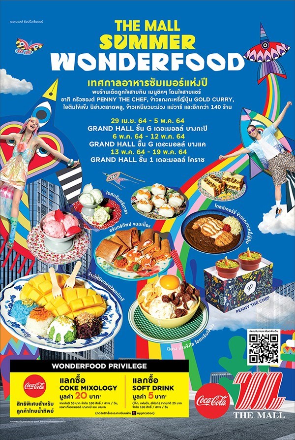 THE MALL SUMMER WONDERFOOD ยกขบวนความอร่อยไว้ในที่เดียว ได้รวบรวมเมนูยอดฮิตจากร้านดัง และร้านยอดนิยมในโซเชียลมีเดียมาให้นักชิมได้ลิ้มรสความอร่อย อาทิ Penny The Chef ร้าน เบเกอรีชื่อดังของเชฟเพนนี กับเมนูยอดนิยมที่การันตีความอร่อยกับ "ครัวซองต์อร่อยยืนหนึ่ง", Gold Curry ข้าวแกงกะหรี่จานยักษ์สไตล์คานาซาว่า ประเทศญี่ปุ่น มีหลากหลายไซส์ให้เลือกรับประทาน, ไอศกรีมศรีมาลา ไอศกรีมดอกไม้และผลไม้สไตลโฮมเมดหนึ่งเดียวในไทยสร้างสรรค์เมนูไอศกรีมที่ทำจากดอกไม้ไทยท้องถิ่นอาทิ อัญชัน เข็ม กุหลาบ บัว และ ดาหลา, ข้าวเหนียวมูนแม่วารี ร้านข้าวเหนียวมะม่วงในตำนานใจกลางย่านทองหล่อ เปิดมากว่า 30 ปี, นิอ่าง น้ำแข็งไส ไอศกรีม ตลาดพลู ร้านขนมหวานประเภทหวานเย็น ต้นตำรับ ‘ไอศกรีมกะทิไข่แข็ง’ แห่งตลาดพลู, สรินทร์ทิพย์ ขนมเบื้อง ขนมเบื้องโบราณ เปิดมากว่า 110 ปี ความพิเศษคือใช้น้ำตาลมะพร้าว แป้งขนมเบื้องหอมกรอบหนาแต่ไม่แข็ง ไม่ใส่ผงกรอบ และสารกันบูด
