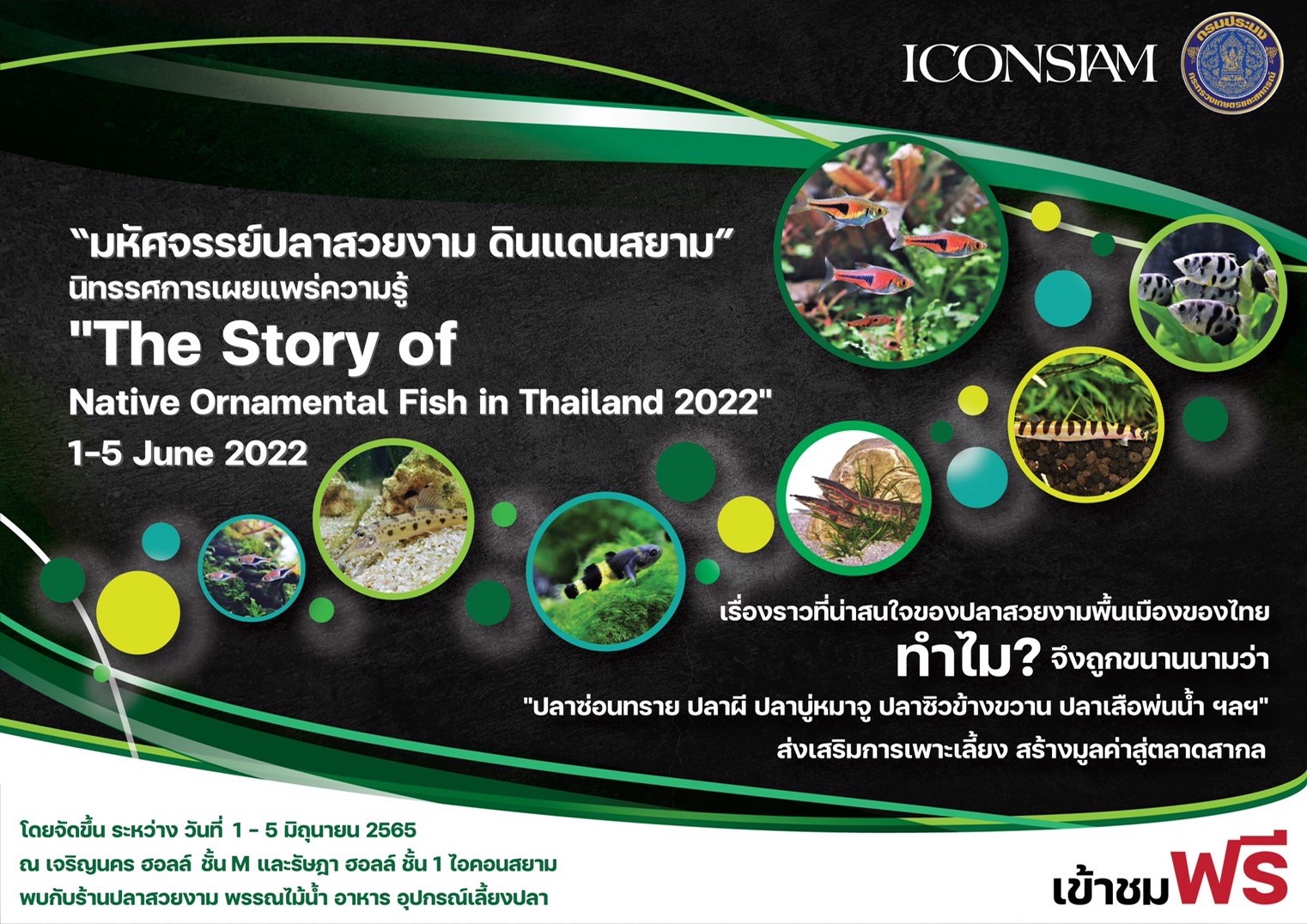 กรมประมง และ ไอคอนสยาม เชิญร่วมชมงาน “มหัศจรรย์ปลาสวยงามดินแดนสยาม” ในระหว่างวันที่ 1-5 มิถุนายน 2565 ณ บริเวณเจริญนคร ฮอลล์ ชั้น M และรัษฎา ฮอลล์ชั้น 1 ไอคอนสยาม ซึ่งกำหนดจัดขึ้นภายใต้ธีม “The Story Of Native Ornamental Fish in Thailand 2022” งานเดียวที่ร้อยเรียงเรื่องผ่านการ “เล่าเรื่องปลาสวยงามผ่านความภาคภูมิใจในแผ่นดินสยาม” ในแง่มุมที่ต่าง ๆ ที่มีเอกลักษณ์โดดเด่น ทรงคุณค่า ทั้งทางด้านเศรษฐกิจและการอนุรักษ์ สร้างสมดุลสู่ความยั่งยืน พร้อมกระตุ้นธุรกิจปลาสวยงามของไทยให้ยืนหนึ่งในระดับโลก