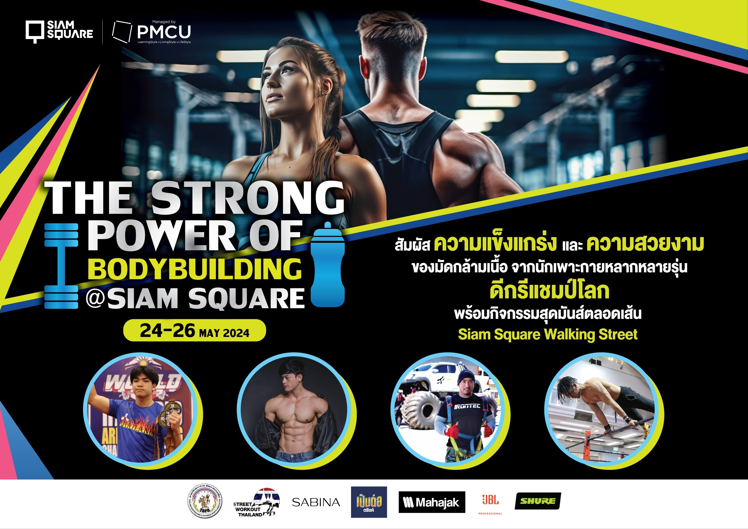 สยามสแควร์ร่วมกับ สมาคมกีฬาเพาะกายและฟิตเนส แห่งประเทศไทย และ Street workout Thailand จัดงาน The Strong Power of Bodybuilding @Siam Square ชวนสัมผัสความแข็งแกร่ง             ชมความสวยงามของมัดกล้ามเนื้อ จากนักเพาะกายดีกรีแชมป์โลก  พร้อมเปิดประสบการณ์ Bodybuilding : Powering Up Strength for a Stronger You ครั้งแรกใจกลางสยามสแควร์ ระหว่างวันที่ 24-26 พฤษภาคม 2567 ตลอดเส้น Walking Street  สยามสแควร์