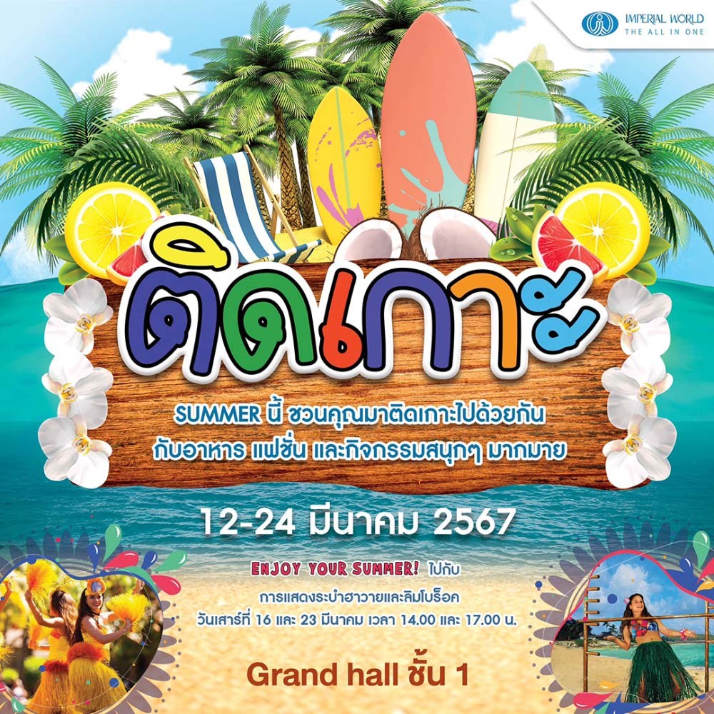 Summer นี้ อิมพีเรียล ขอชวนคุณมาติดเกาะคลายร้อนไปด้วยกัน กับอาหาร แฟชั่น และกิจกรรมสนุก ๆ มากมาย พบกับร้านยำสุดแซ่บชื่อดัง “เจ๊ฝน ยำแซ่บซิ่ง” และร่วมสนุกไปกับระบำฮาวาย ที่จะชวนคุณโยกย้ายไปกับบรรยากาศทะเลซัมเมอร์ พบกันในงาน ติดเกาะ