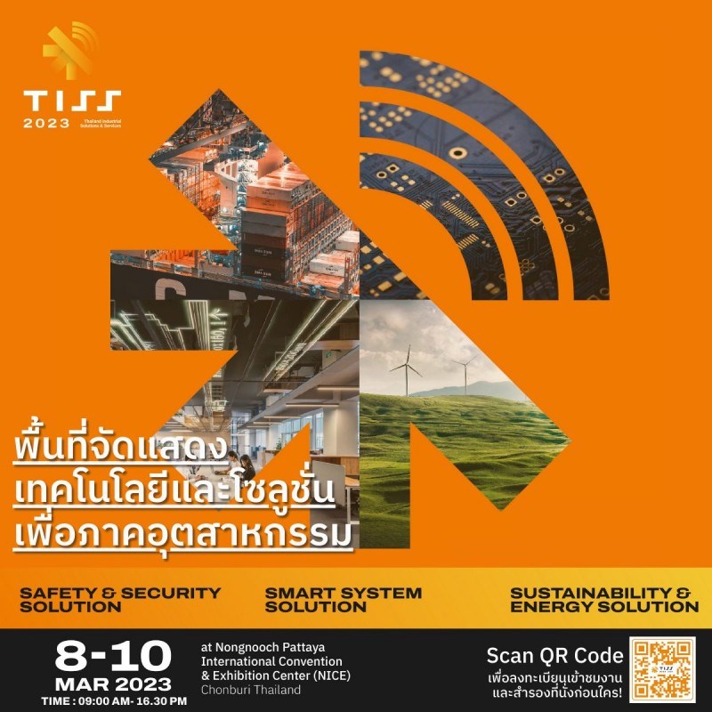 วันที่ 8 - 10 มีนาคม 2566 เวลา 09.00 - 16.30 น. ณ ศูนย์ประชุมและจัดแสดงสินค้านานาชาติ NICE นงนุช พัทยา TISS - Thailand Industrial Solutions & Services 2023 งานแสดงเทคโนโลยีโซลูชั่นและสัมมนาวิชาการ พร้อมปลุกกระแสโซลูชั่น 3s - Safety, Smart, Sustainable อัปเดตเทรนด์อุตสาหกรรมอย่างครบครันสู่ความยั่งยืนไปด้วยกัน พร้อมบุกกลุ่มอุตสาหกรรมในพื้นที่เศรษฐกิจตะวันออก EEC เชื่อมโยงกับผู้ซื้อขายกว่า 20,000 ราย! แล้วพบกัน วันที่ 8 - 10 มีนาคม 2566 (พุธ-ศุกร์) 09.00 - 16.30 น. ณ ศูนย์ประชุมและจัดแสดงสินค้านานาชาติ NICE นงนุช พัทยา เข้าชมงาน ฟรี! ไม่มีค่าใช้จ่าย