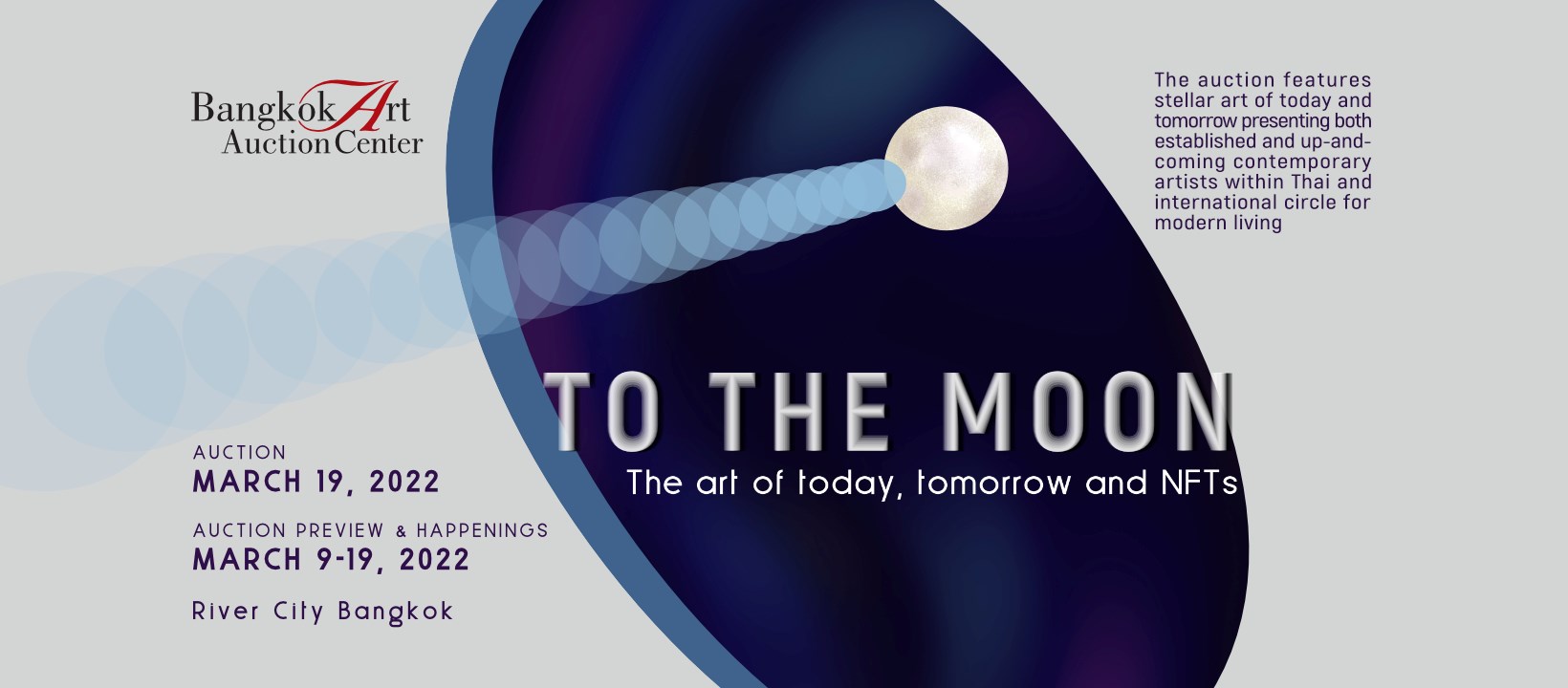 Bangkok Art  Auction Center ภายใต้ชื่องาน TO THE MOON” จัดงานประมูลที่เป็นแหล่งรวมงานศิลปะแห่งเจนเนอเรชั่น ผลงานชิ้นเอกจากศิลปินหลากหลาย ทั้งศิลปินที่ได้รับการยอมรับอย่างกว้างขวางผ่านกาลเวลา ศิลปินรุ่นใหม่ที่เป็นดาวรุ่งพุ่งแรงและศิลปิน NFT (Non-fungible token)  ที่เป็นจังหวะก้าวของวงการศิลปะในวันนี้ to the moon จึงเป็นที่รวมของคนรุ่นใหม่ผู้รักในศิลปะมีรสนิยมในการใช้ชีวิต เราเชื่อว่าศิลปะเป็นสิ่งสำคัญหนึ่งสำหรับวิถีชีวิตระดับคุณภาพของคนในยุคนี้