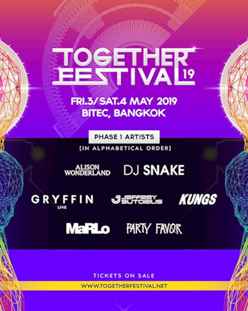 เพียงแค่เผย Line Up ดีเจแถวหน้าระดับหัวกระทิของโลกเฟสแรกที่เปิดตัว ก็เรียกเสียงฮือฮาได้อย่างหนัก กับ Line Up สุดเดือด ศิลปินกลุ่มแรกของ Together Festival 2019 ปีนี้ เตรียมตัวพบกับ DJ SNAKE ขอต้อนรับเจ้าพ่อสาย Trap อย่าง “DJ SNAKE” ที่การันตีความเดือดอย่างแน่นอน เดือดจนคอหักกันไปข้างเลย! ปีนี้พี่งูของเรา จะมาพร้อมกับตัวแม่อีกคน ALISON WONDERLAND เธอคนนี้ได้เคยแสดงเอาไว้ตอนมาไทยครั้งก่อนได้อย่างดุเดือดมากๆ หลายคนถึงกับเรียกร้องอยากให้กลับมาอีก! ครั้งนี้เธอกลับมาหวดอย่างเต็มที่เลย GRYFFIN (Live) การนำพา “GRYFFIN” มาเล่นครั้งนี้แบบ Live set! รับรองเลยว่าทุกคนต้องจดจำกับความอลังการของการเล่นเครื่องดนตรีแบบสดๆให้เราได้ชมกัน , JEFFREY SUTORIUS (DASH BERLIN) ด้วยการกลับมาของ “JEFFREY SUTORIUS” หรือที่เรารู้จักกันดีในชื่อ “DASH BERLIN” กลับมาให้พวกเราหายคิดถึงกันไปเลย, และ สุดท้ายเสริมทัพด้วย 3 แสบ KUNGS, MARLO และ PARTY FAVOR พร้อมรอ Line Up กลุ่มที่ 2 ที่แสบไม่แพ้กันแน่นอน