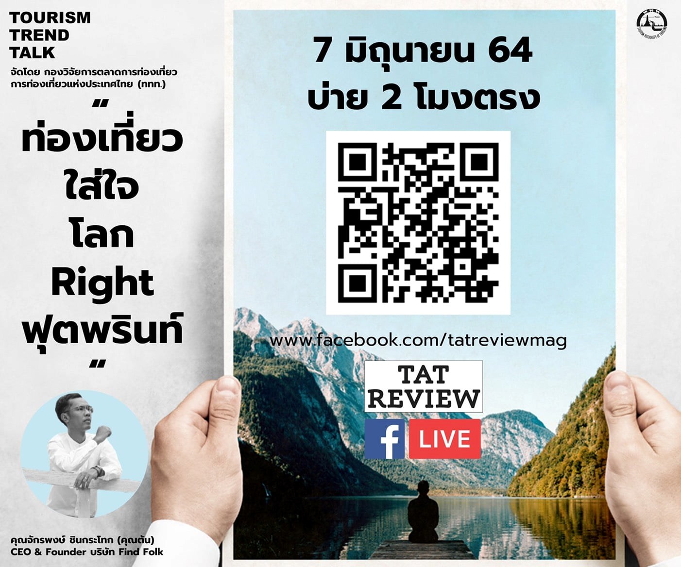 ศูนย์วิจัยด้านตลาดการท่องเที่ยว ททท. (TATIC) ขอเชิญชวนผู้ที่สนใจมาร่วมรับฟังเสวนา Tourism Trend Talk LIVE “ท่องเที่ยวใส่ใจ โลก Right ฟุตพรินท์” มาทำความเข้าใจ Carbon footprint อย่างแท้จริง เจาะโอกาสทางธุรกิจ ลดโลกร้อนไปด้วยกัน กับวิทยากรรักษ์โลกคนนี้เลย คุณต้น จักรพงษ์ ชินกระโทก CEO & Co-Founder จากบริษัท Find Folk