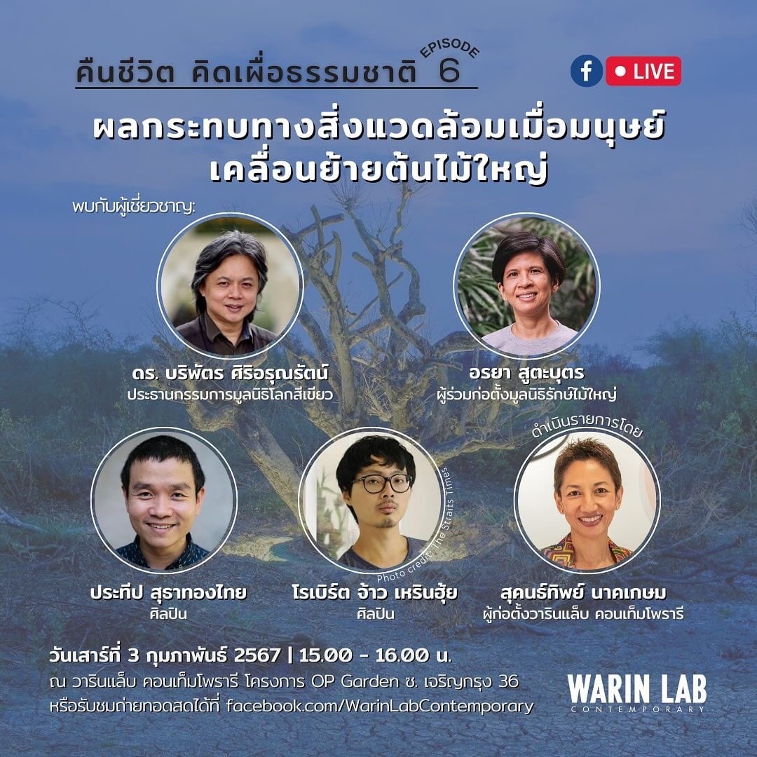 งานเปิดนิทรรศการ “Tree Management Agency” จะจัดขึ้นในวันเสาร์ที่ 3 กุมภาพันธ์ 2567 โดยจะเริ่มต้นด้วยกิจกรรมเสวนาเกี่ยวกับผลกระทบของการเคลื่อนย้ายต้นไม้ใหญ่ ณ เวลา 15.00 - 16.00 น. ที่ วารินแล็บ คอนเท็มโพรารี โดยมีผู้เข้าร่วมสนทนาดังนี้:
