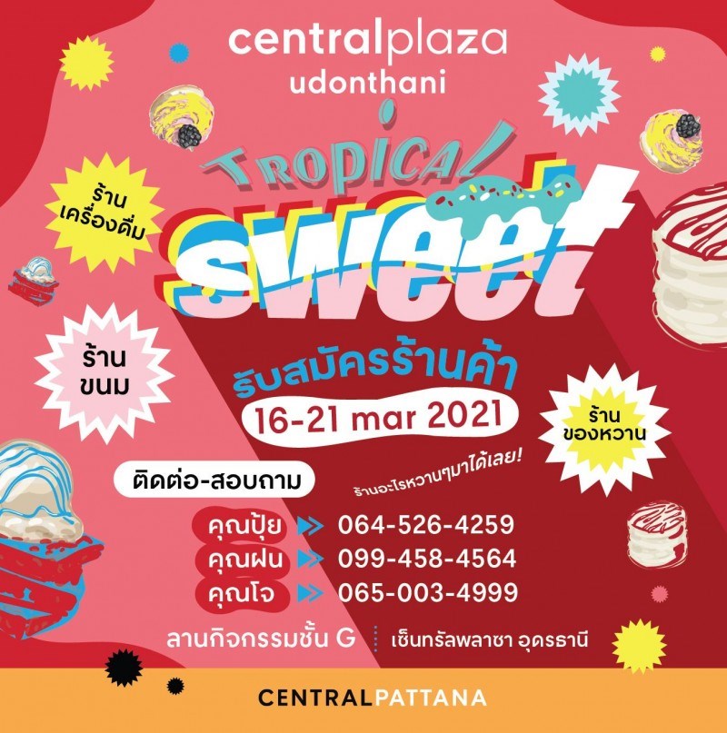 Tropical Sweet วันที่ 16 - 21 มีนาคม 2564 ณ ลานกิจกรรม ชั้น G เซ็นทรัลพลาซา อุดรธานี พบกับ ขนมหวานฉ่ำ ๆ ไอศครีมเจลาโต้ และเครื่องดื่มนานาชนิด ที่จะมามอบความสดชื่นในช่วงซัมเมอร์นี้ ในงาน "Tropical Sweet"
