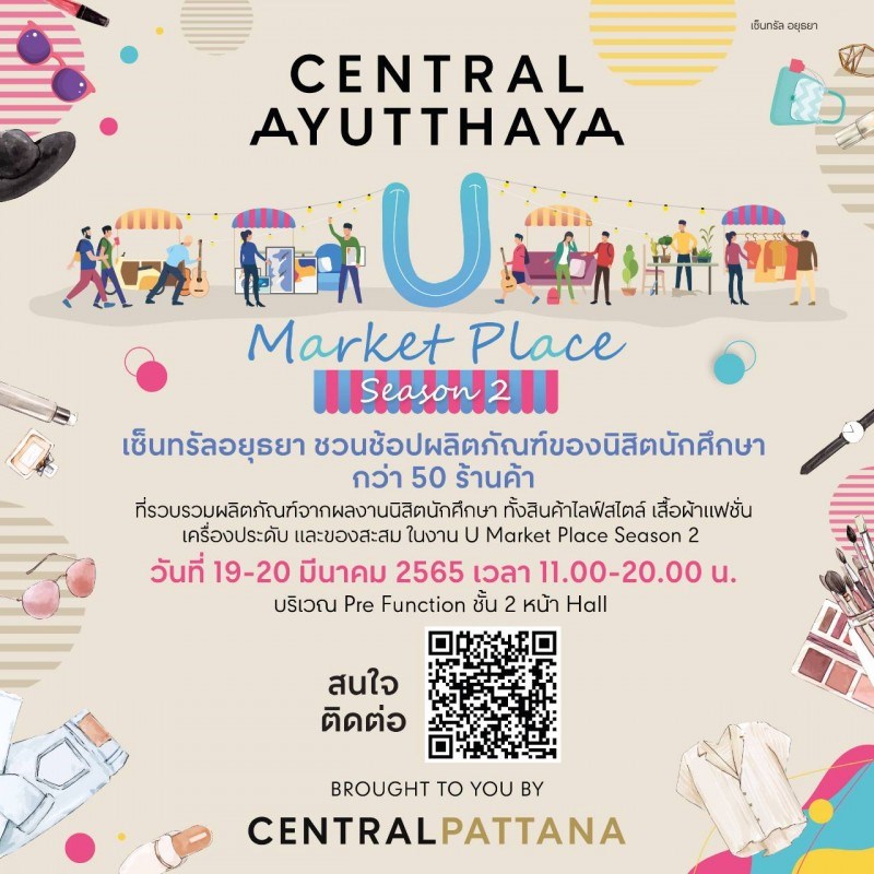 วันที่ 19 - 20 มีนาคม 2565 ณ เซ็นทรัลอยุธยา กลับมาตามคำเรียกร้อง! U Market Place ตลาดนัดนักเรียน นักศึกษา ครั้งที่ 2 เปิดพื้นที่ขายฟรีกับผลิตภัณฑ์จากฝีมือนักเรียน นักศึกษา สินค้าแฟชั่นมือ 1 มือ 2 วันเสาร์-อาทิตย์ ที่ 19-20 มีนาคม 2565 เวลา 11.00 - 22.00 น. บริเวณหน้า Ayutthaya Hall ชั้น 2 ศูนย์การค้าเซ็นทรัล อยุธยา