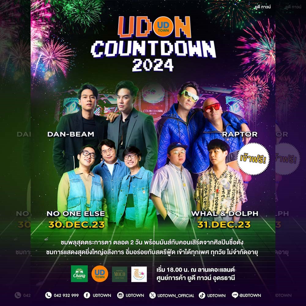UDON COUNTDOWN 2024 ร่วมเฉลิมฉลองส่งท้ายปีเก่า ต้อนรับปีใหม่ ชมพลุสุดตระการตา จัดเต็ม 2 วัน 2 คืน การแสดงสุดยิ่งใหญ่อลังการ อิ่มอร่อยไปกับสตรีทฟู้ดร้านเด็ด งานนี้เข้าฟรี! ได้ทั้งครอบครัว ไม่จำกัดอายุ บนพื้นที่ความสนุกใหญ่ที่สุดที่เคยมีมา เตรียมตัวให้พร้อมกับปรากฏการณ์ครั้งยิ่งใหญ่ที่กำลังจะมาให้กระหึ่มอุดร วันที่ 30 - 31 ธ.ค. 66 ณ ลานเดอะแลนด์ ศูนย์การค้ายูดี ทาวน์ อุดรธานี ประตูเปิดตั้งแต่ 6 โมงเย็น เป็นต้นไป