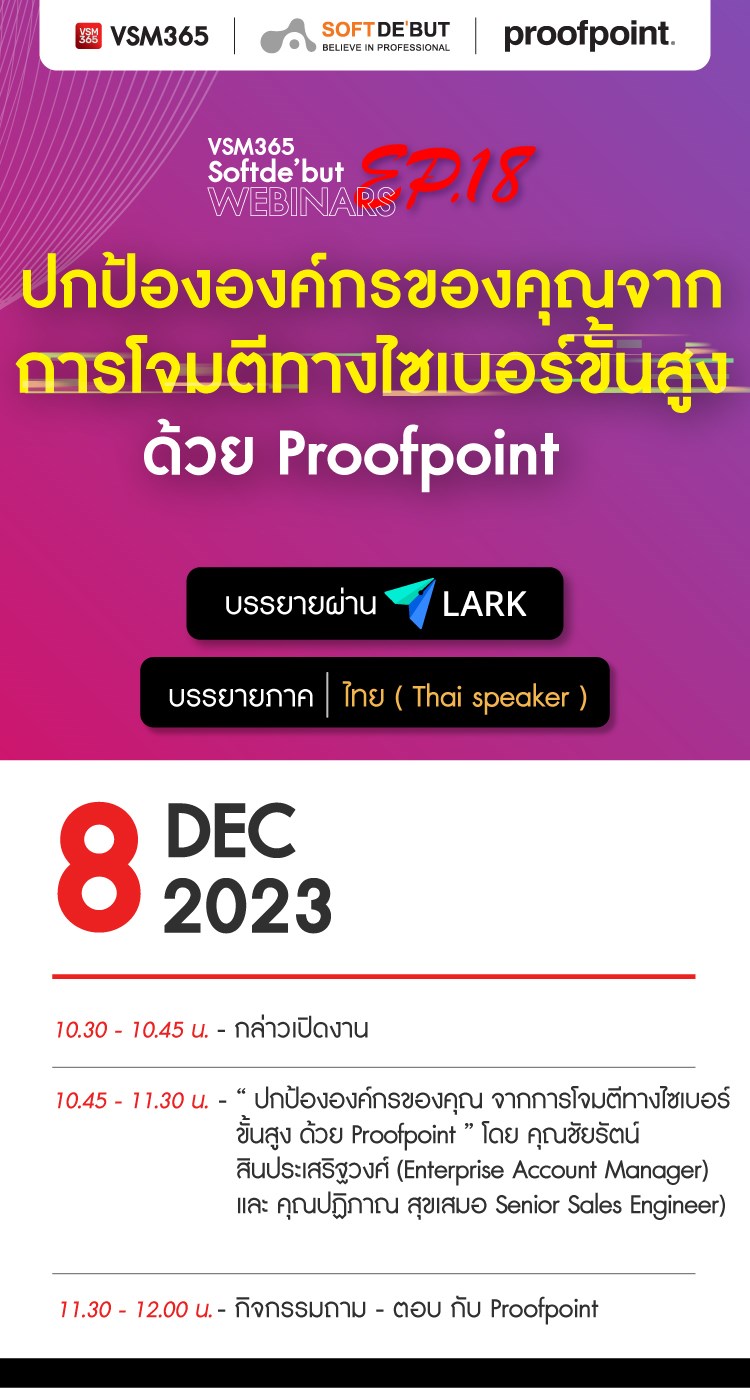 VSM365 | Webinar Ep.18 ในหัวข้อ ❝ ปกป้ององค์กรของคุณ จากการโจมตีทางไซเบอร์ขั้นสูง ด้วย Proofpoint ❞