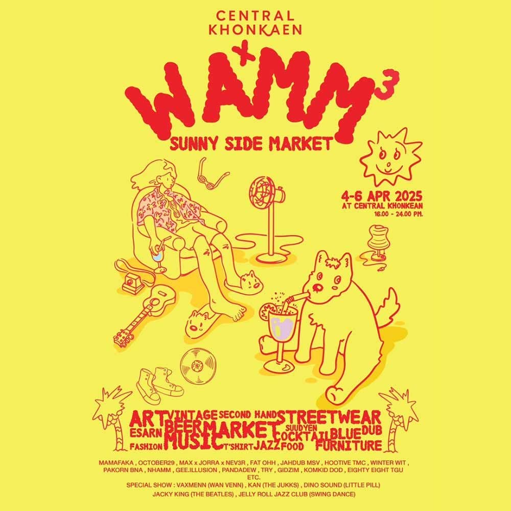 4 - 6 เม.ย. นี้ ชวนชาวขอนแก่นมาจอยกับงานตลาดวินเทจที่ยิ่งใหญ่ที่สุดของขอนแก่น Central Khonkaen x WAMM present WAMM SUNNY SIDE MARKET ร่วมจัดงาน flea market รับลมร้อนในธีม summer พบปะพูดคุยแลกเปลี่ยนของกัน ไม่ว่าจะเป็นสินค้ามือสอง ของเก่าวินเทจ รวมไปถึงของตกแต่งบ้านที่น่าสนใจ