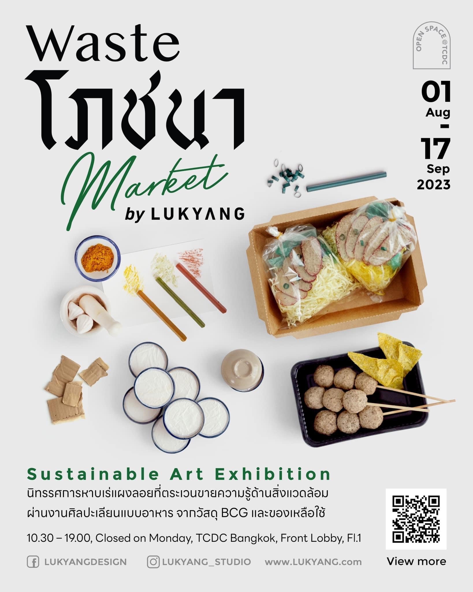 Waste โภชนา เกิดจากความชื่นชอบในด้านการพับกระดาษเป็นอาหาร และสิ่งแวดล้อม ซึ่งเคยจัดมาแล้วครั้งหนึ่งในงาน Bangkok Design Week 2023 เป็นนิทรรศการหาบเร่แผงลอยที่จะตระเวนขายความรู้ในยุคที่ทุกคนหันมาใส่ใจสิ่งแวดล้อมมากขึ้น เพื่อแนะนําวิธีการใช้ของเหลือใช้ ที่เกิดจากตัวเราให้ถูกวิธี และของเหลือใช้ประเภทไหนที่ไม่ควรนํากลับมาใช้ซ้ำแล้วบ้าง เพื่อให้สิ่งแวดล้อมกับตัวเราเองปลอดภัยไปด้วยกัน ผ่านงานศิลปะเลียนแบบอาหาร ซึ่งถูกปรุงมาจากของเหลือใช้ต่างๆ กับวัสดุ BCG ของ LUKYANG