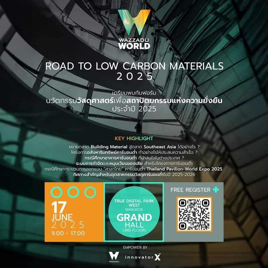 Wazzadu World ฟอรัมนวัตกรรมวัสดุศาสตร์เพื่อสถาปัตยกรรมแห่งความยั่งยืนประจำปี 2025 ปีนี้จัดขึ้นภายใต้แนวคิด Road To Low Carbon Materials 2025
