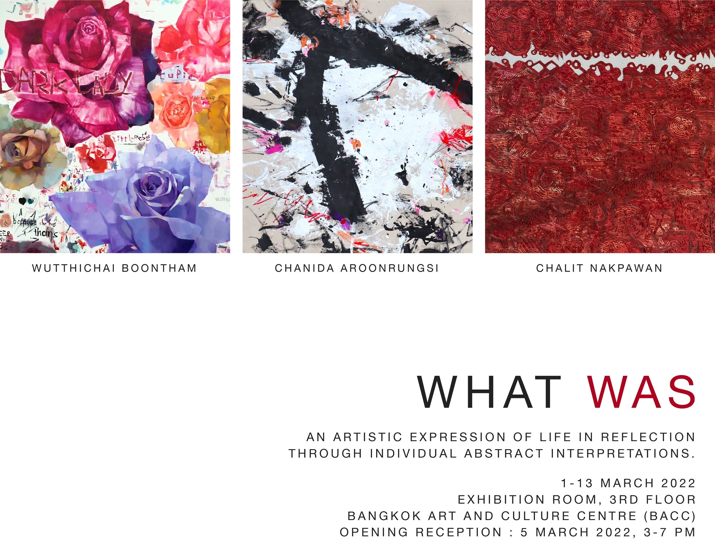 “WHAT WAS” นิทรรศการศิลปะนามธรรม โดยการรวมตัวกันเป็นครั้งแรกของ 3 ศิลปินมากความสามารถ ได้แก่ ชนิดา อรุณรังษี, วุฒิชัย บุญธรรม, และชลิต นาคพะวัน ซึ่งจะมาร่วมถ่ายทอด WHAT WAS ในรูปแบบของตัวเอง สะท้อนมุมมองชีวิตต่อสิ่งที่ผ่านมาในอดีตอย่างงดงาม ผ่านชิ้นงานศิลปะนามธรรมเชิงสัญลักษณ์ (Abstract) ด้วยสไตล์ที่แตกต่างกัน โดยจัดแสดงตั้งแต่วันนี้ จนถึง 13 มีนาคม 2565 เวลา 10.00 – 19.00.น. ณ ห้องแกเลอรี ชั้น 3 หอศิลปวัฒนธรรมแห่งกรุงเทพมหานคร