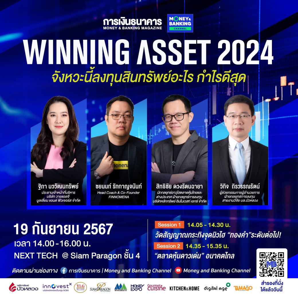 วารสารการเงินธนาคาร จัดงานสัมมนาในหัวข้อ “Winning Asset 2024 : จังหวะนี้ลงทุนสินทรัพย์อะไร กำไรดีสุด” ในวันพฤหัสบดีที่ 19 กันยายน 2567 เวลา 14.00-16.00 น. ณ Siam Paragon Next Tech ชั้น 4 เพื่ออัปเดตสถานการณ์เศรษฐกิจ มุมมองการลงทุนทั่วโลก พร้อมชี้โอกาสลงทุนในช่วงครึ่งหลังปี 2567 สินทรัพย์อะไรให้ผลตอบแทนดีที่สุด โดยผู้เชี่ยวชาญชั้นนำของเมืองไทยมาให้ข้อมูลแบบเจาะลึก พร้อมคำแนะนำในการจัดพอร์ตการลงทุนอย่างไรให้ชนะทุกสภาวะตลาด ในงานสัมมนา “Winning Asset 2024 : จังหวะนี้ลงทุนสินทรัพย์อะไร กำไรดีสุด”