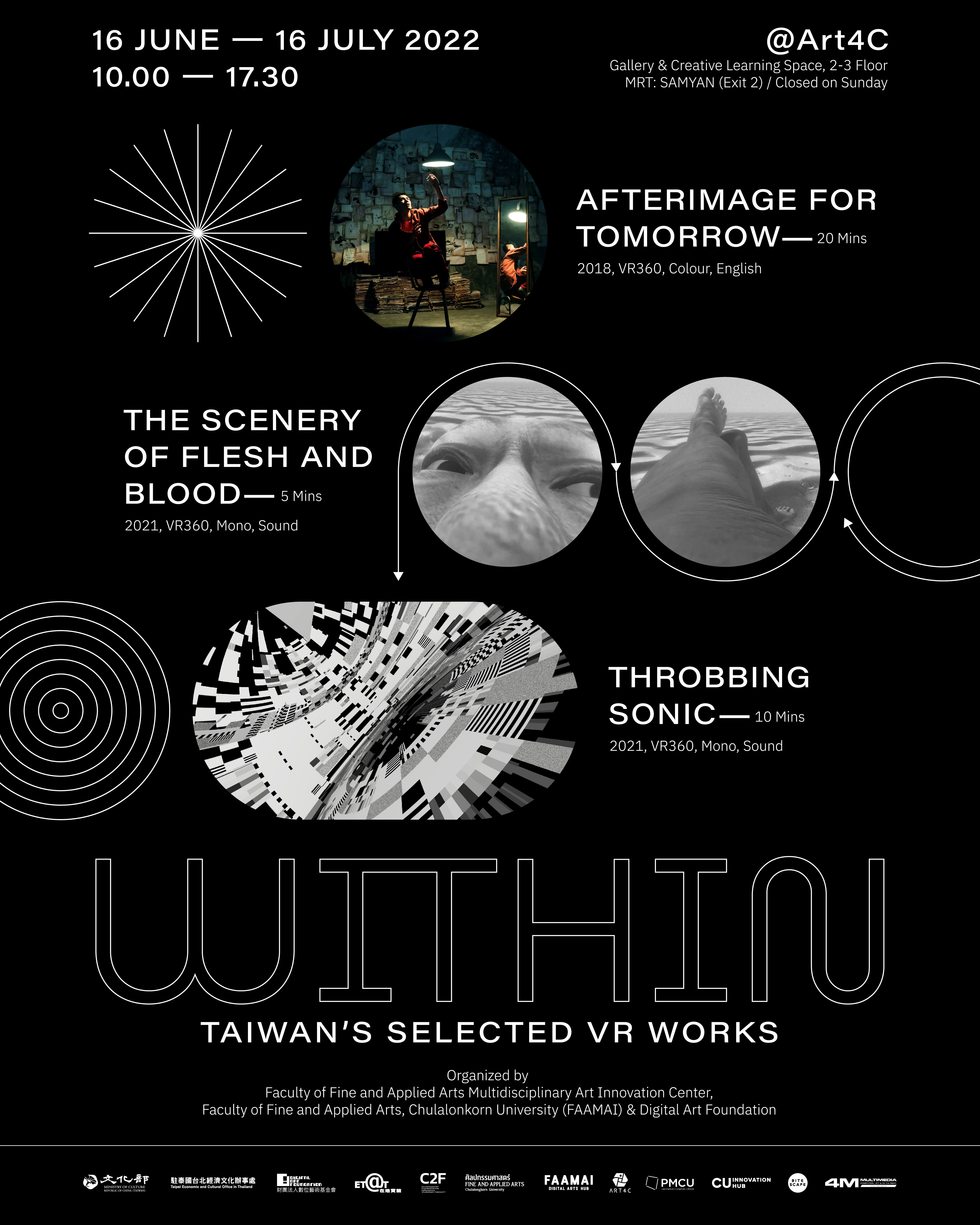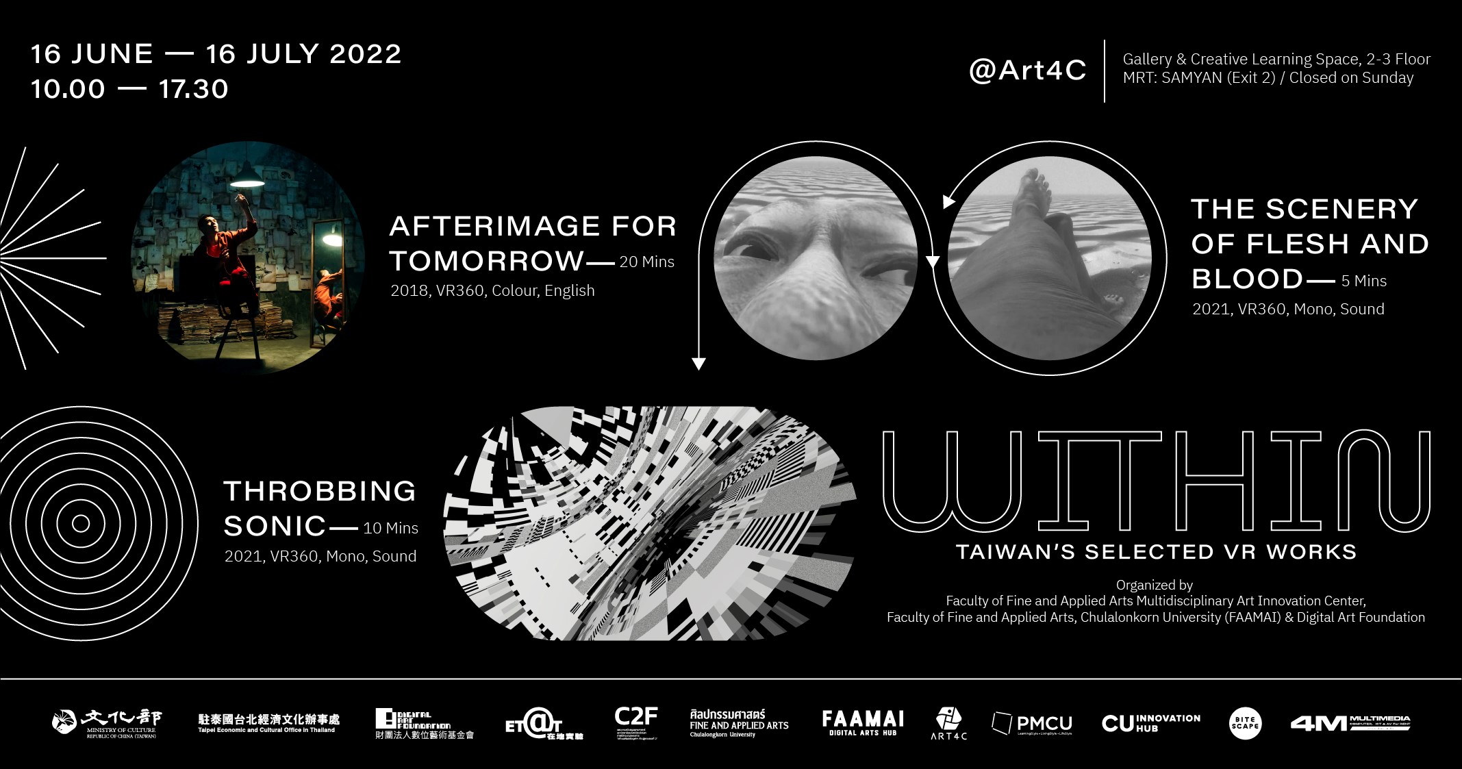 “WITHIN_Taiwan’s Selected VR Works” เป็นผลงานเสมือนจริง 3 ชุดจากไต้หวัน ซึ่งนำมารวมกันเพื่อนำเสนอการใช้ VR ที่เพิ่มมากขึ้นในหลายสาขาเพื่อสร้างผลงานหลากหลายในช่วงหลายปีที่ผ่านมา ตั้งแต่ภาพยนตร์, Sound Arts จนถึง Contemporary Dance ผลงานในนิทรรศการครั้งนี้ กล่าวถึงผลงานดั้ง เดิมของตัวมันเอง โดยตีความในรูปแบบดิจิทัล ผ่านผลงาน Throbbing Sonic ผลงาน The Scenery of Flesh Blood และผลงาน Afterimage for Tomorrow โดยผลงานที่จัดแสดงในครั้งนี้ พยายามจะดึงเอาคุณค่าหลักระหว่างรูปแบบงานศิลปะและเนื้อหาออกมา