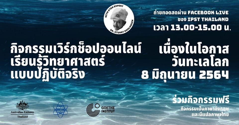 กิจกรรมเวิร์กช็อปออนไลน์เรียนรู้วิทยาศาสตร์แบบปฏิบัติจริง โดย ดร.สจ๊วต โคลฮาเกน (Dr. Stuart Kohlhagen) จัดขึ้นในวันที่ 8 มิถุนายน 2564 ตั้งแต่เวลา 13.00-15.00 น. ผ่านไลฟ์สดบนหน้าเฟซบุ๊คของสถาบันส่งเสริมการสอนวิทยาศาสตร์และเทคโนโลยี (สสวท.) กิจกรรมนี้เป็นการมุ่งประเด็นไปที่เรื่องสมุทรศาสตร์ฟิสิกส์ (Physical Oceanography) ผ่านซีรีส์กิจกรรมเวิร์กช็อปออนไลน์เพื่อสร้างแรงบันดาลใจให้แก่ครูผู้สอน นักจัดกิจกรรมด้านการศึกษาวิทยาศาสตร์ และผู้ปกครอง ซีรีส์กิจกรรมเวิร์กช็อปในครั้งนี้จัดขึ้นโดยความร่วมมือระหว่างสถานเอกอัครราชทูตออสเตรเลีย ประจำประเทศไทย สถาบันส่งเสริมการสอนวิทยาศาสตร์และเทคโนโลยี (สสวท.) และสถาบันเกอเธ่ ประเทศไทย สำหรับกิจกรรมเวิร์กช็อปออนไลน์ครั้งที่สองจะจัดขึ้นในวันที่ 22 กรกฎาคม 2564 เนื่องในโอกาสวันสมองโลก โดยกิจกรรมทั้งสองครั้งจะจัดเป็นภาษาอังกฤษและมีแปลภาษาไทยและสามารถเข้ารับชมได้ทางออนไลน์ผ่านไลฟ์สดบนหน้าเฟซบุ๊ค IPST Thailand ของ สสวท. และบนเว็บไซต์ SEADSTEM แพลตฟอร์มดิจิทัลด้านสะเต็มศึกษาระดับภูมิภาคเอเชียตะวันออกเฉียงใต้ (www.seadstem.org)
