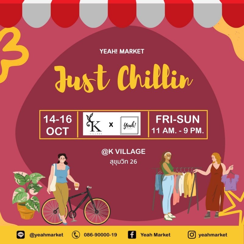 งาน "Just Chillin" มาร่วมขายของอัพเดตเทรนด์แฟชั่นสุดชิค มีทั้งโซนแฟชั่นและโซนอาหาร ด้านในมีกิจกรรมโชว์น้องหมาด้วยน้า แล้วพบกันที่ K Village วันที่ 14 - 16 ต.ค. 2565 วันศุกร์-อาทิตย์ 11.00 - 21.00 น.