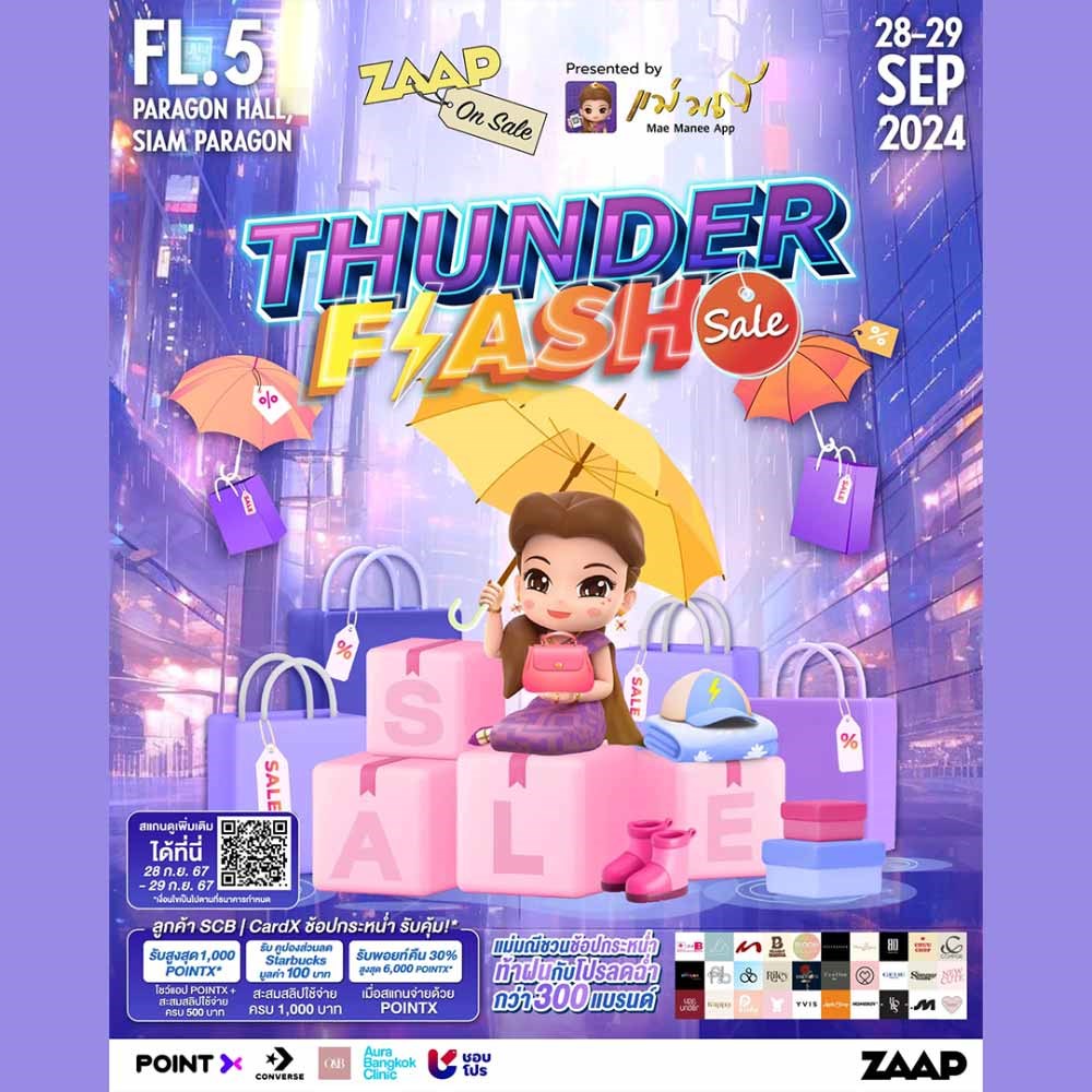 ZAAP ON SALE ครั้งที่ 36 Presented by แม่มณี THUNDER FLASH SALE มาช้อปกระหน่ำท้าฝนกับโปรลดฉ่ำกว่า 300 แบรนด์ แถมยังมีโปรโมชั่นลดสูงสุดมากถึง 80% งานนี้รับรองครบจบคุ้มในที่เดียว ภายในงานจะมีกิจกรรมให้ร่วมสนุกตลอดทั้งงาน ช้อปกระหน่ำรับคุ้ม พร้อมรับพ้อยท์คืน 30% สูงสุดถึง 6,000 POINTX แล้วมาช้อปฟิน ๆ เที่ยวเพลิน ๆ กัน
