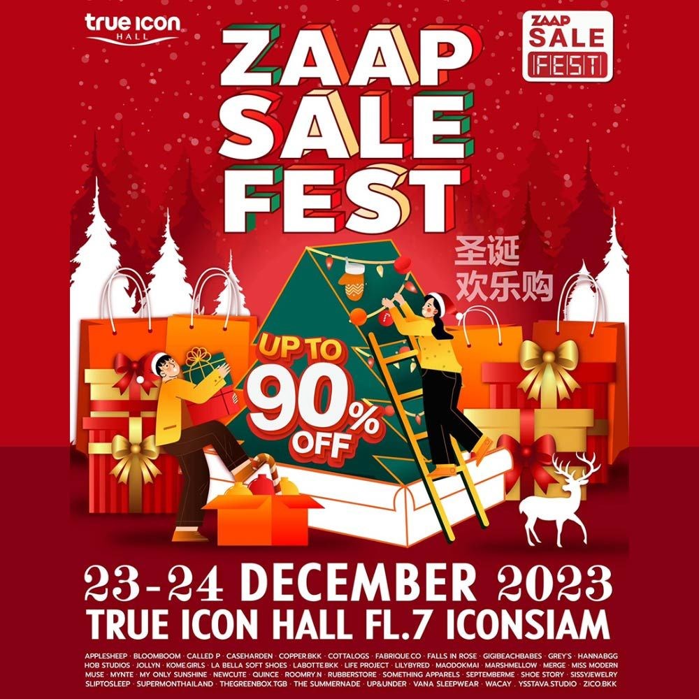 ZAAP SALE FEST งานใหญ่สุดปังรวมสินค้าแบรนด์ดังลดยิ่งใหญ่ส่งท้ายปี! มาร่วมสนุกส่งท้ายปี และมอบความสุขให้กับคนที่รักไปพร้อม ๆ กัน กับ Promotion สุดว้าวจากแบรนด์ดัง ลดสูงสุดถึง 90% และโซนอาหารสุดอร่อย เที่ยว ช็อป ชิม ชิล ครบจบในงานเดียว มีกิจกรรมให้ร่วมสนุกตลอดทั้งงาน และยังได้ลุ้นรับรางวัลใหญ่กันแบบจุก ๆ แจกกระหน่ำถึงสามต่อเลย วันที่ 23 - 24 ธันวาคม 2566 ณ TRUE ICON HALL ชั้น 7 ICONSIAM